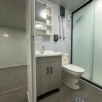 מקלחת, אסלה, כיור, מראה וכל הצנרת הדרושה. אין צורך באינסטלטור – כל התשתיות מותקנות מהמפעל, כולל הכנה לדוד. מבנה אטום, נעים לשימוש, ועמיד לאורך שנים.